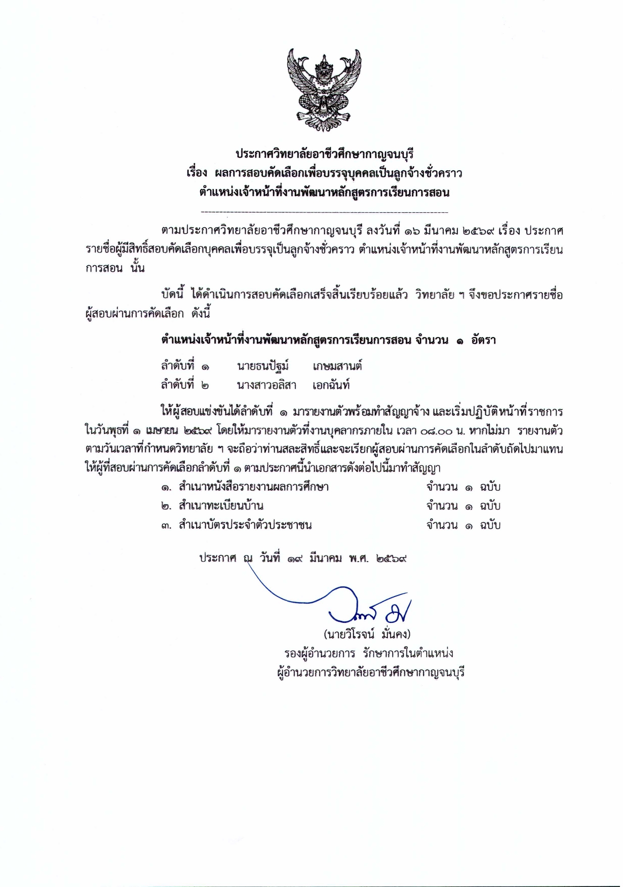 ประกาศผลอย่างเป็นทางการของเจ้าหน้าที่งาน ที่นี่