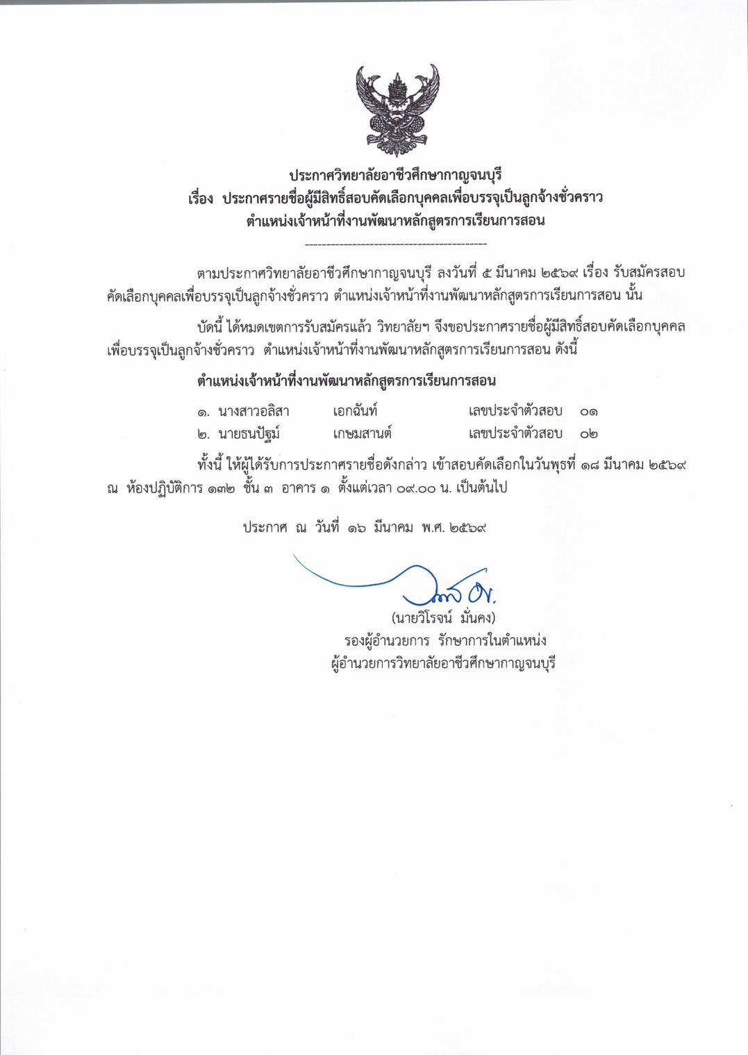 ประกาศรายชื่อผู้มึสิทธิ์สอบบรรจุเป็นชั่วคราวของเจ้าหน้าที่งานในหลักสูตร คลิก